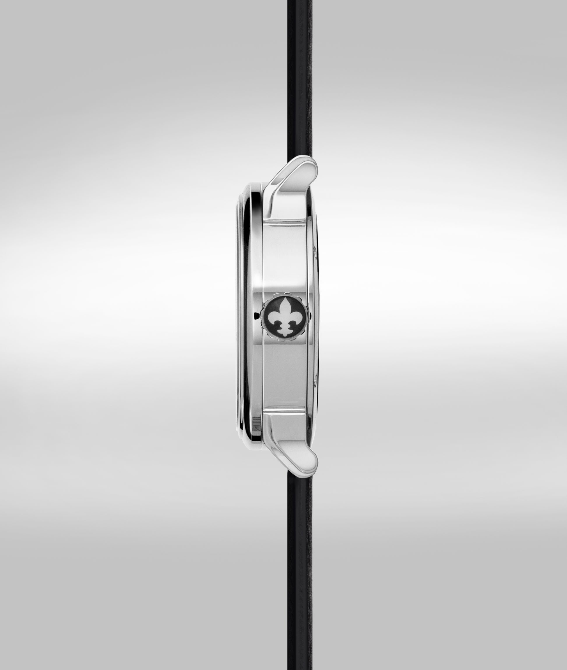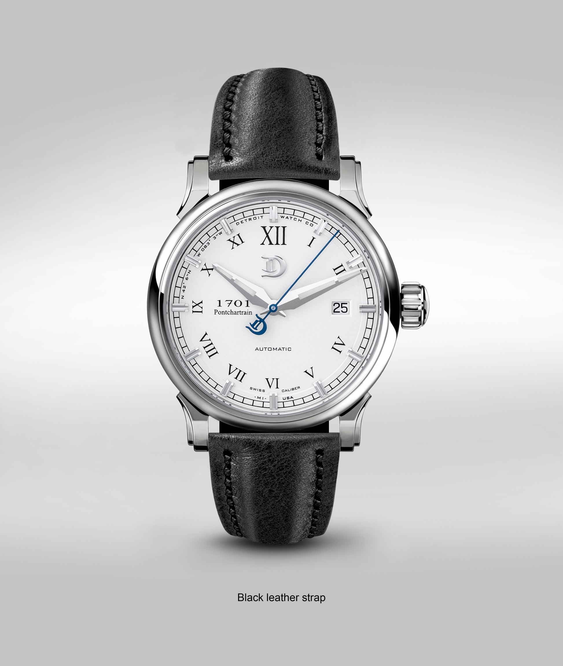 Dial: Silver white satin with black graphics or black with white graphics and hour indexes