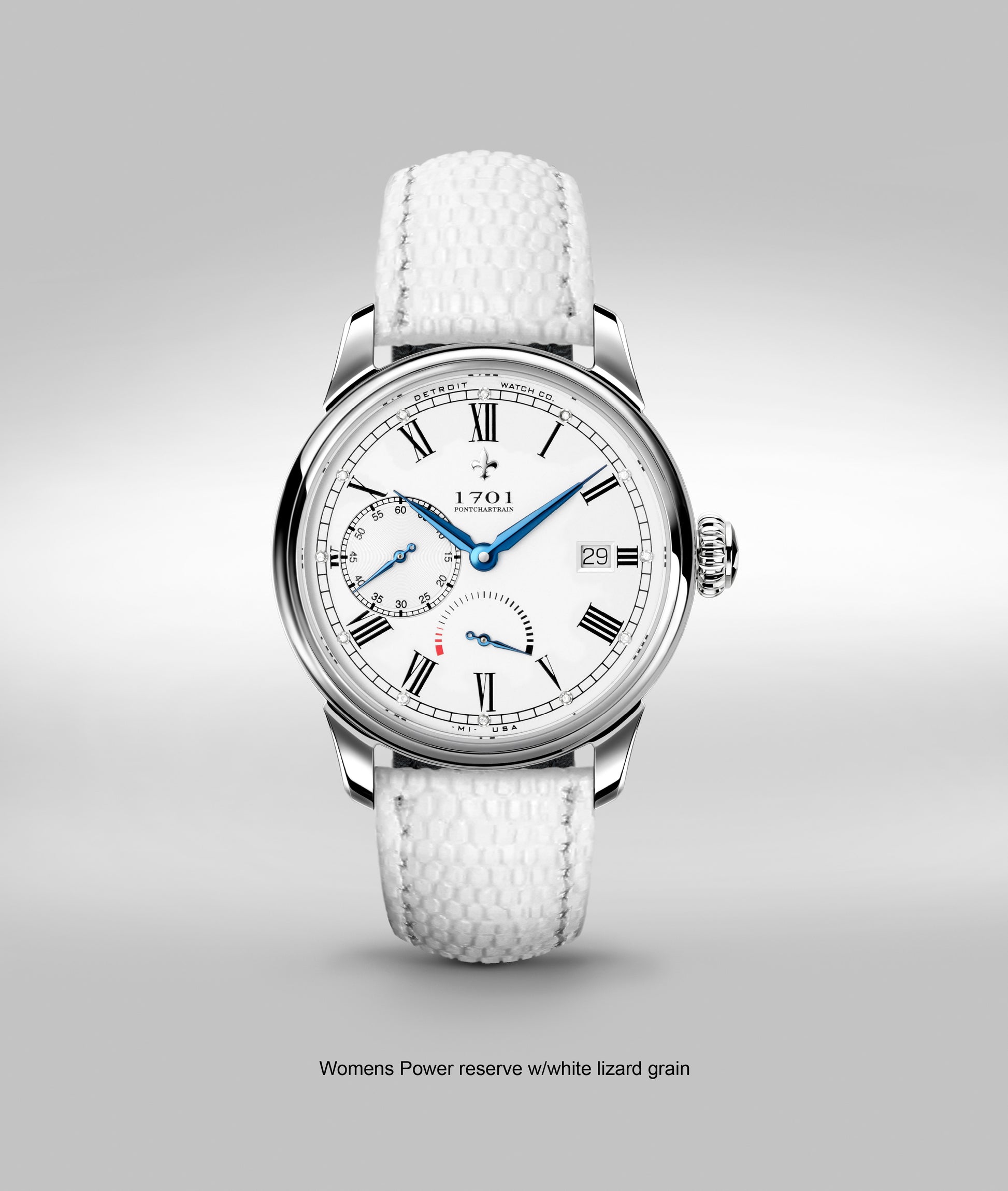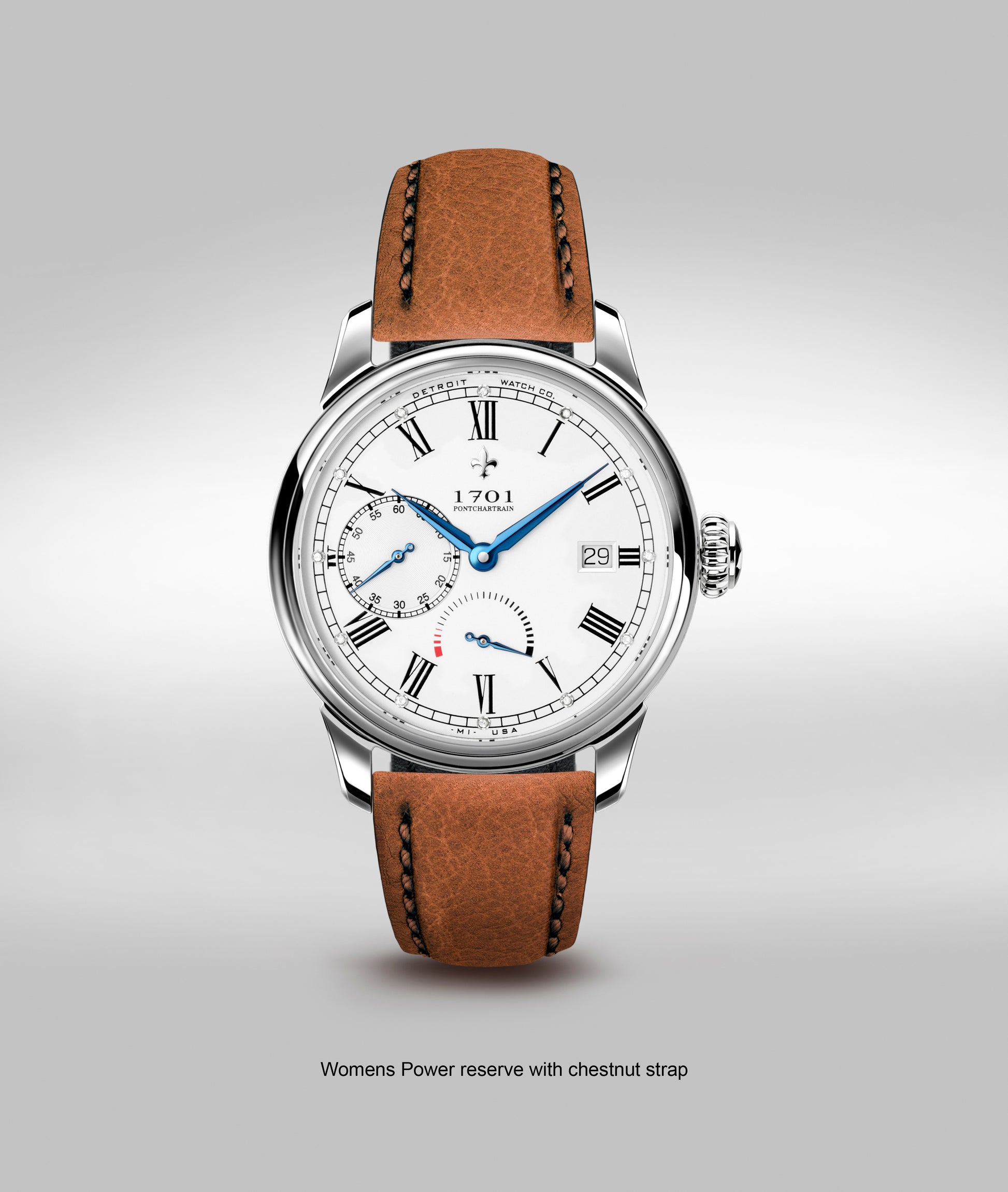39mm case. Automatic self-winding movement with date window. Crown with Detroit Fleur-de-Lys. Calf Leather band with buckle.