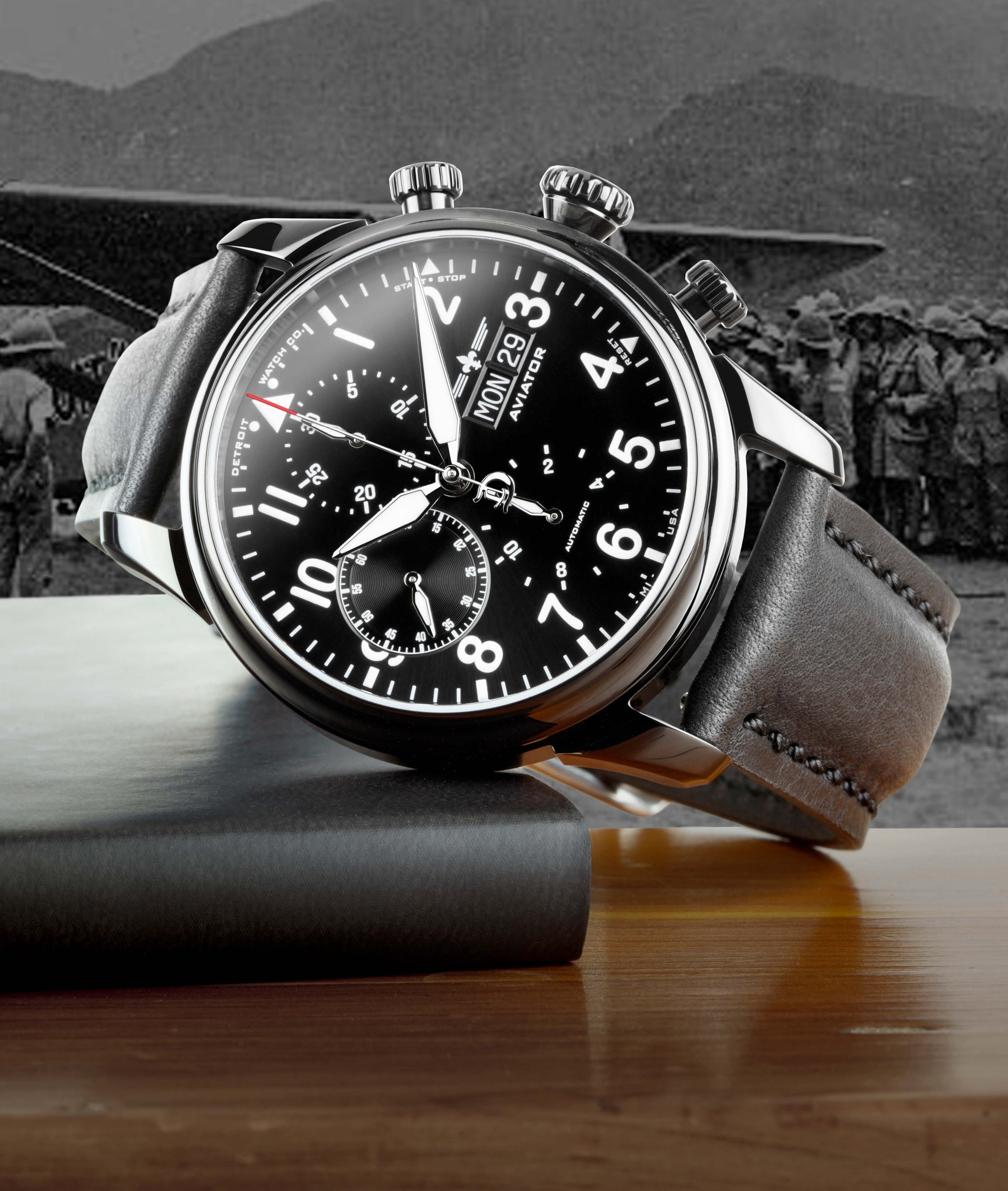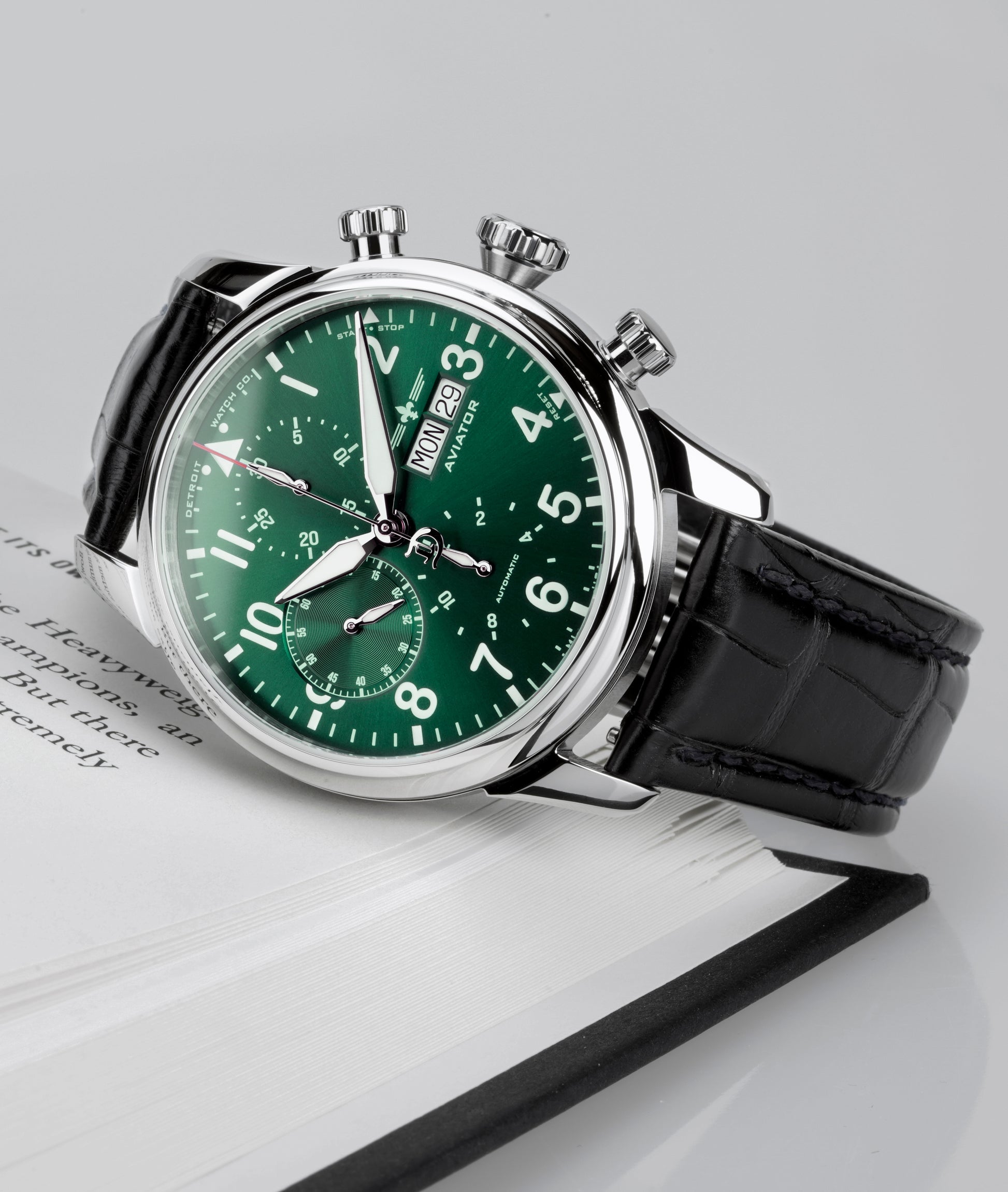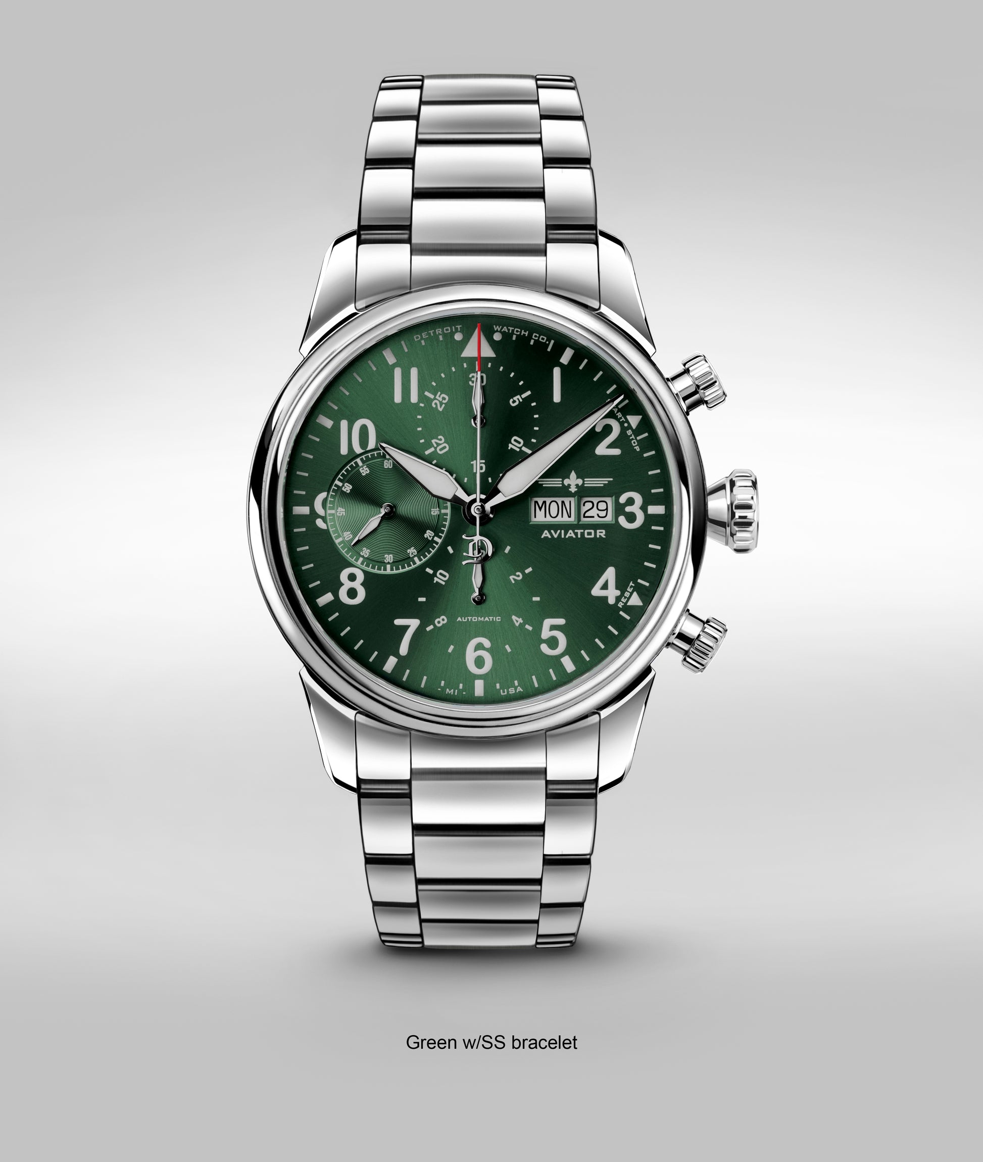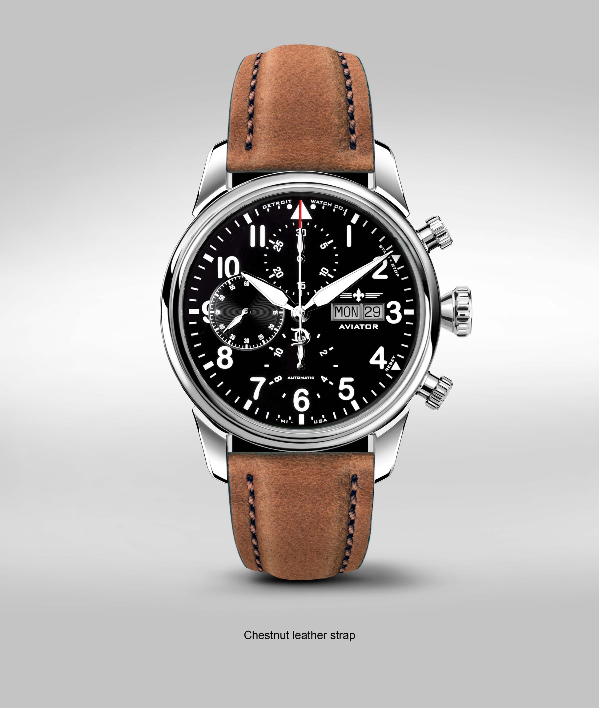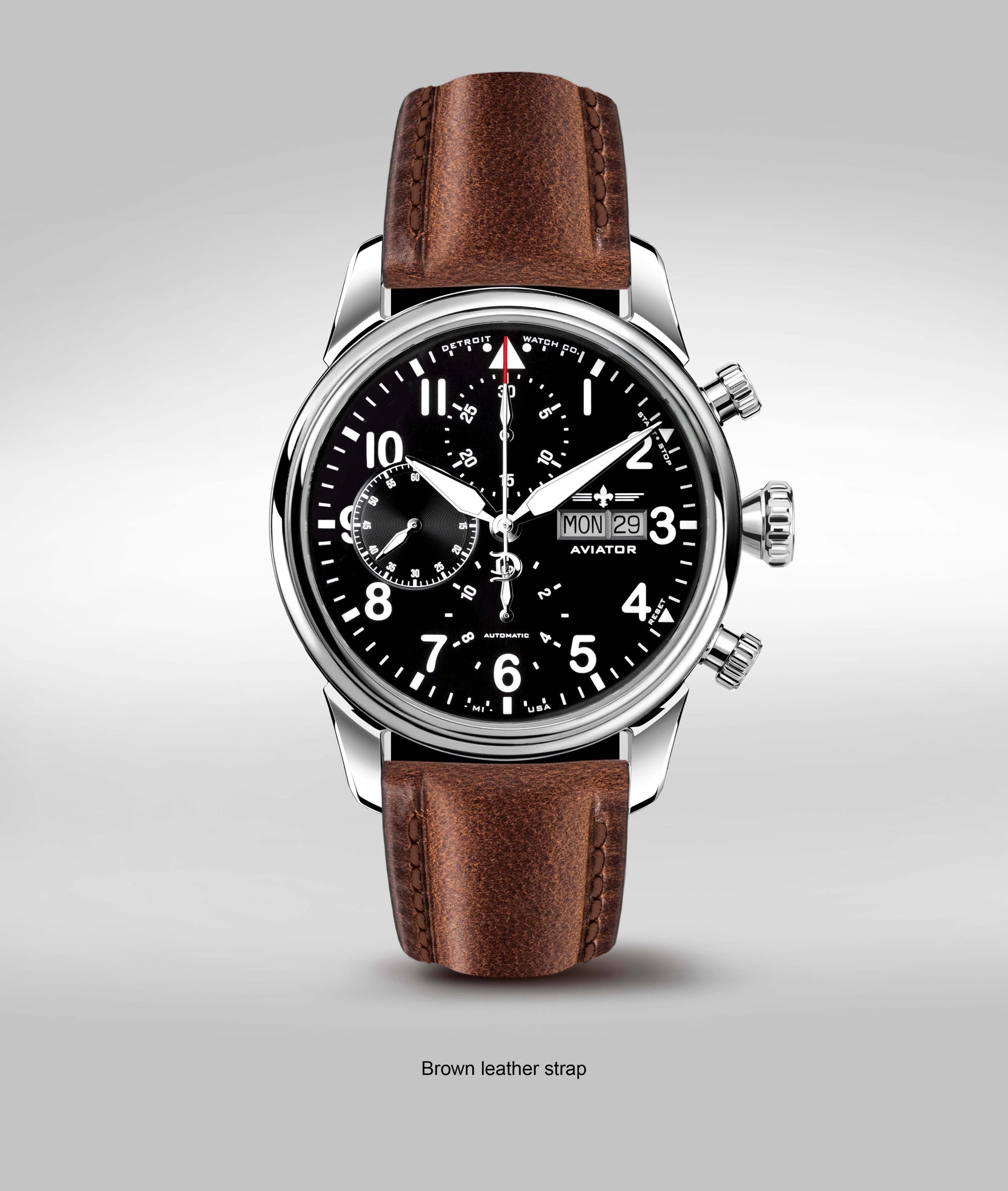 Polished & brushed 42mm case. Automatic self-winding movement with day date window. Crown with black and white Detroit Fleur-de-Lys. Calf Leather band with buckle.
