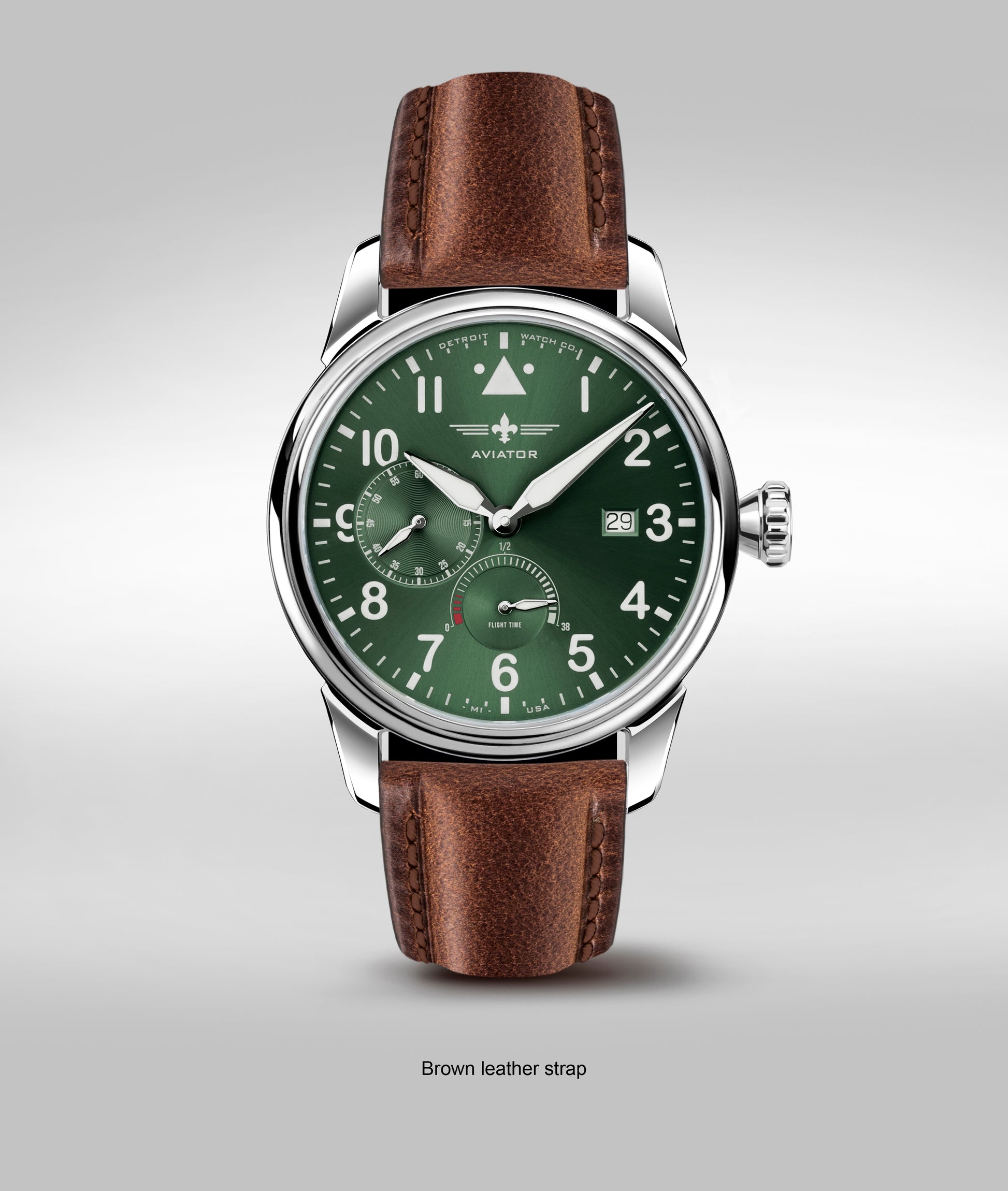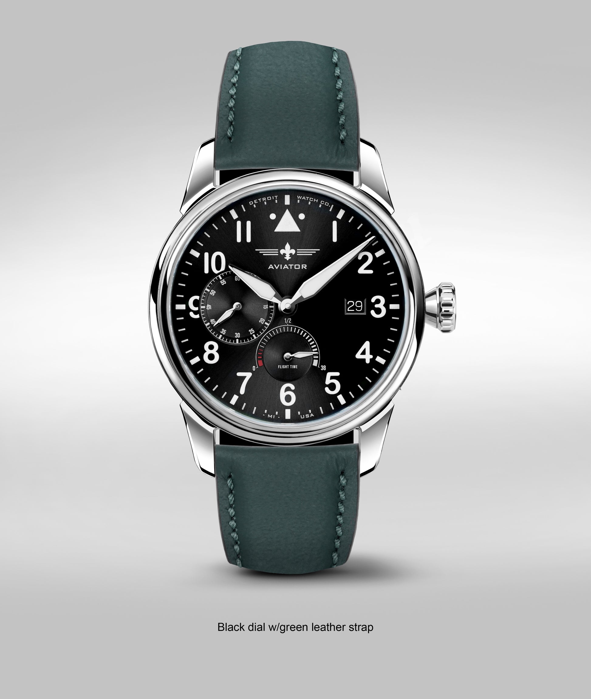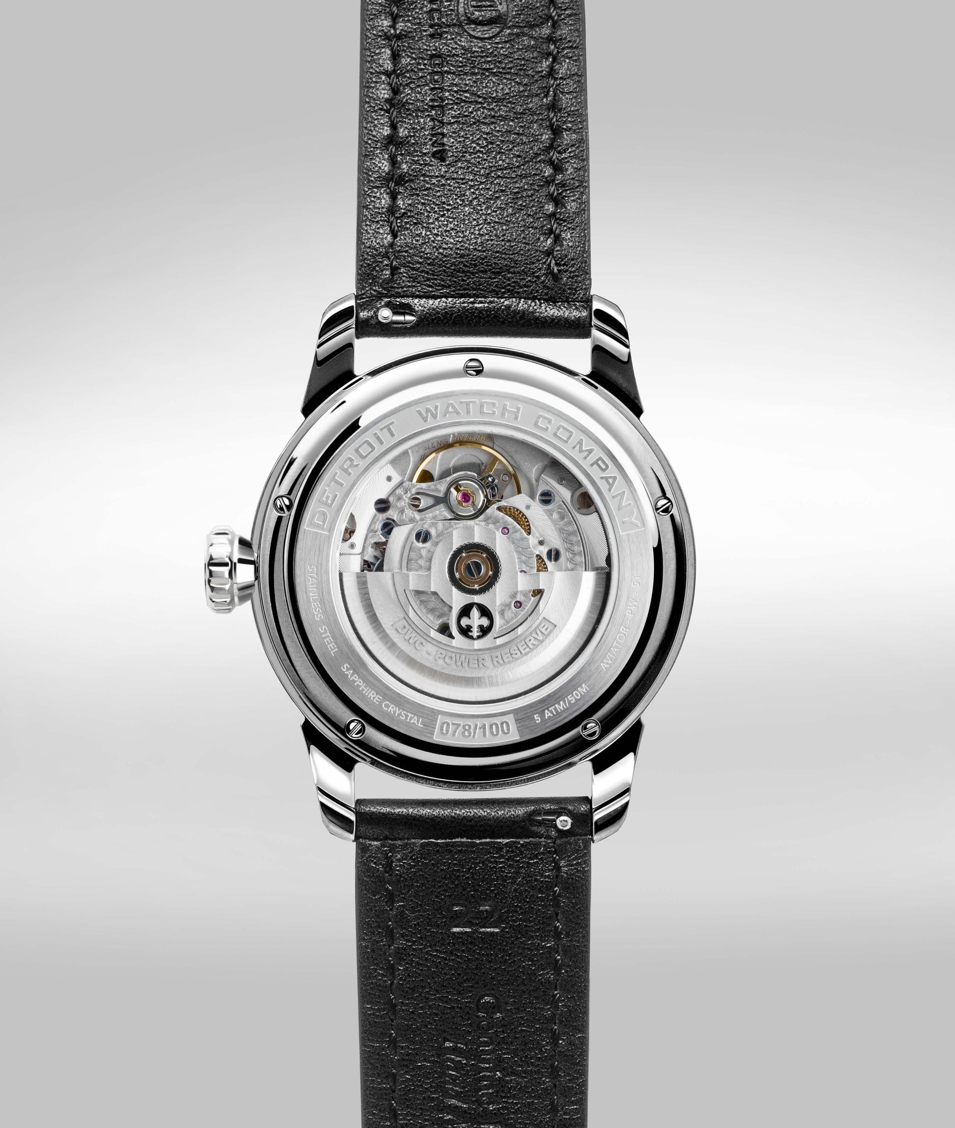 42mm case. Automatic self-winding movement with date window. Crown with Detroit Fleur-de-Lys. Calf Leather band with buckle.