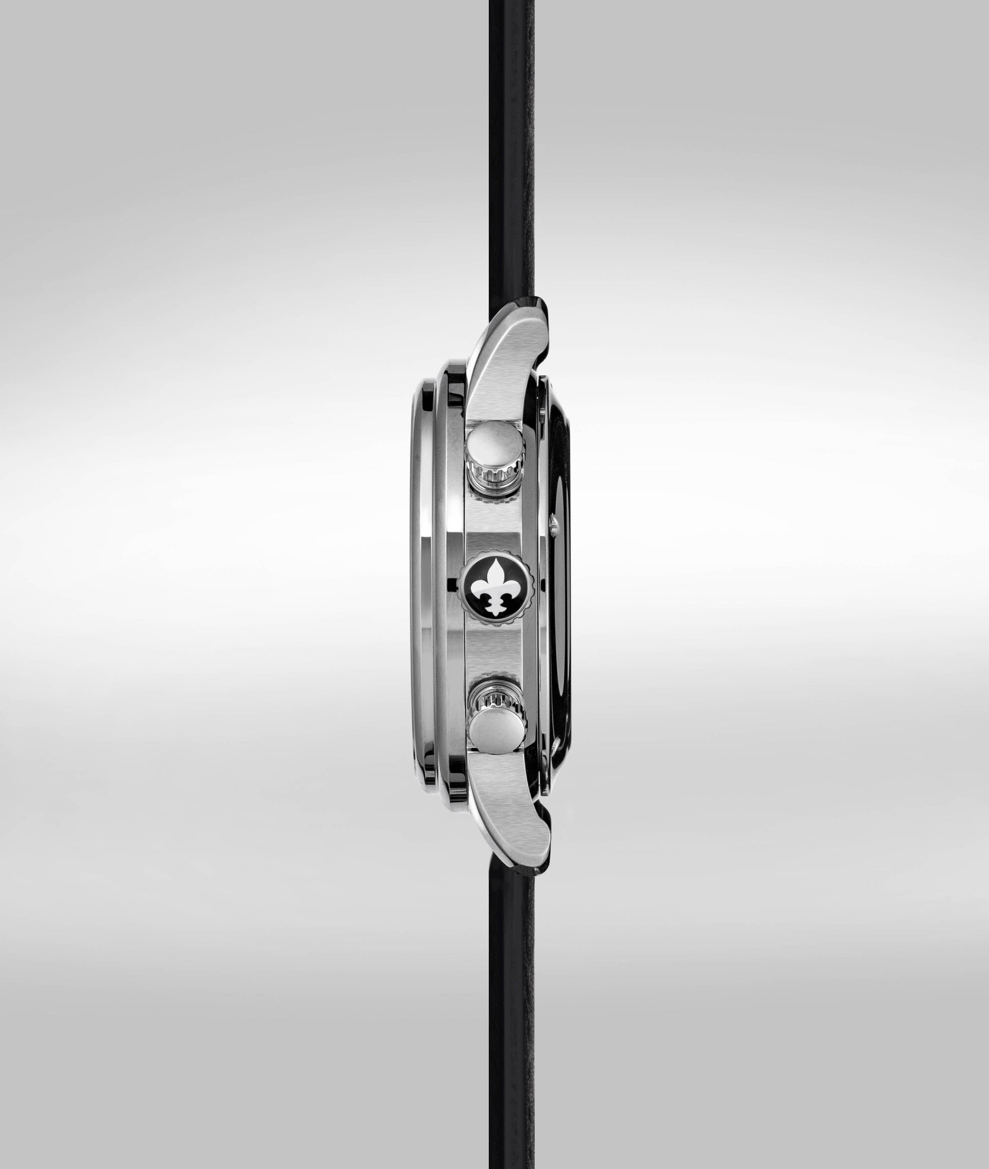 Polished & brushed 42mm case. Automatic self-winding movement. Crown with black and white Detroit Fleur-de-Lys. Calf Leather band with buckle.