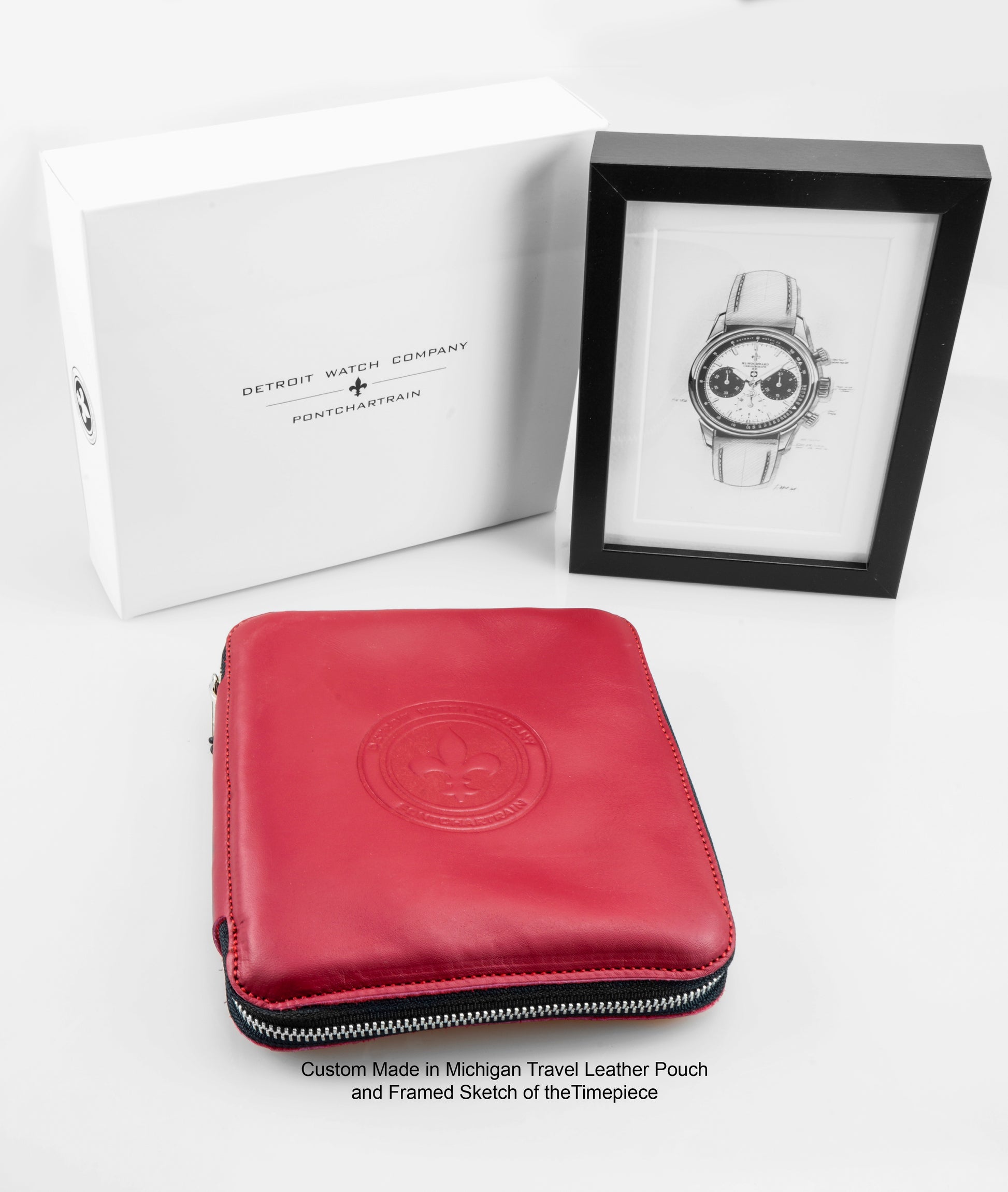 Leather travel pouch: Made in Michigan custom leather and suede travel pouch with timepiece pocket, extra strap pocket and booklets sleeve