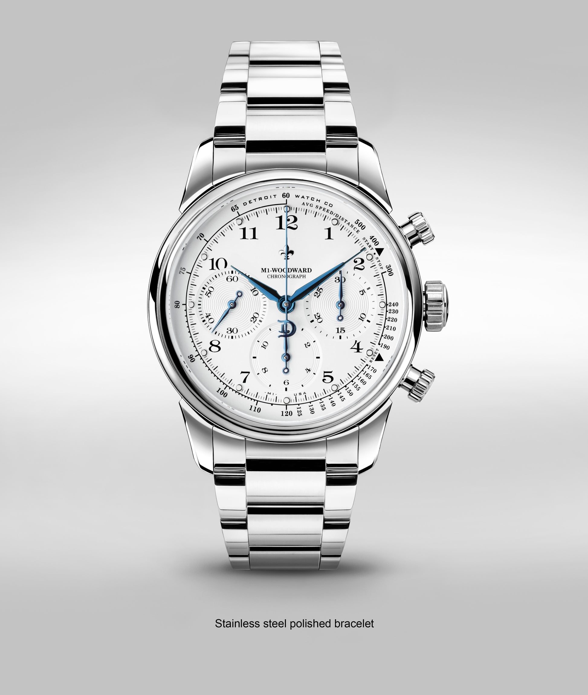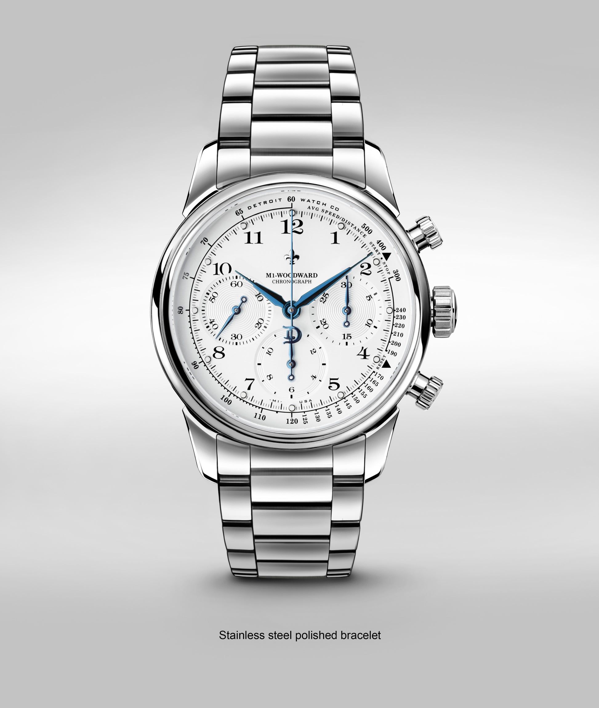 Polished 42mm case. Automatic self-winding movement. Crown with black and white Detroit Fleur-de-Lys. The Woodward chronograph Exhibition caseback showcases the decorated Sw510b movement. Calf Leather band with deployant clasp.