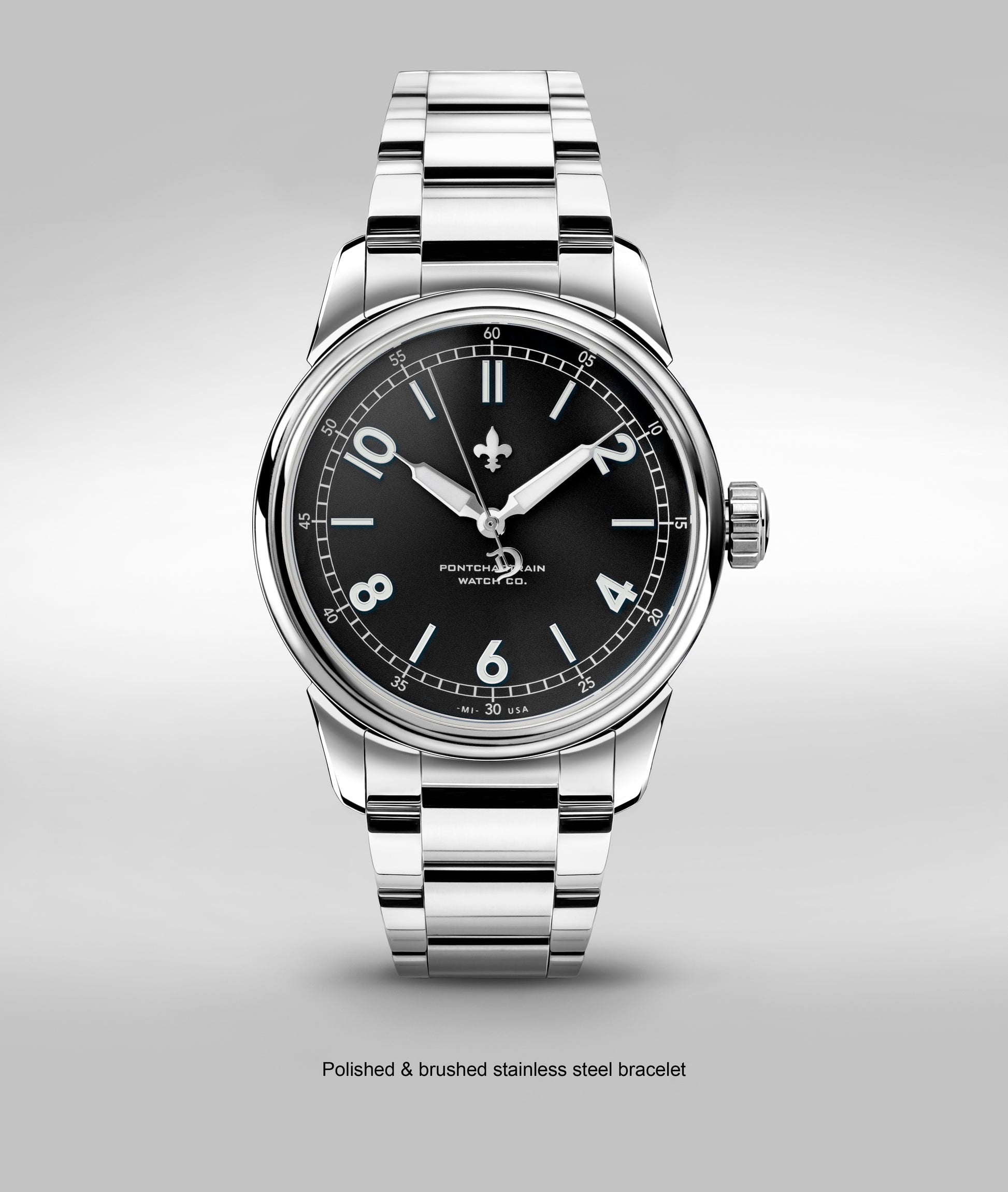 Polished 42mm case. Automatic self-winding Swiss Eta 2892A2 movement with sweep second. Polished hands with Superluminova. Crown with black and white DWC-Pontchartrain Fleur-de-Lys. Raised polished Arabic numerals and indices with lume. Calfskin leather band with deployant clasp.